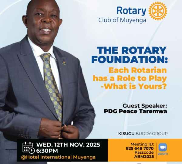 The Rotary Club of Muyenga, under the leadership of President Alex Bwoomezi Mugume, warmly invites you to our fellowship meeting as per the agenda below.